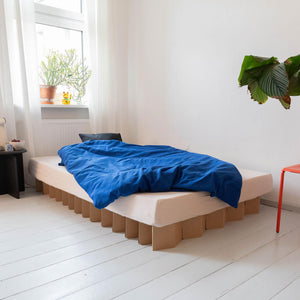 Notre matelas en latex naturel est un excellent choix pour le Lit 2.0 LOW, s’accordant parfaitement avec notre lit en carton durable. En général, tous les types de matelas - sauf les futons - conviennent. Assure-toi que ton matelas a une hauteur minimale de 15 cm et une fermeté de mi-ferme à ferme. Pense aussi à vérifier les recommandations de ton fabricant de matelas.