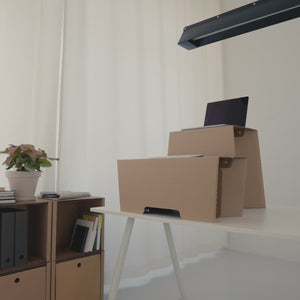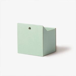 Le tiroir est fabriqué en carton ondulé de haute qualité, contenant 54 à 80 % de matières recyclées. Cela le rend à la fois léger et stable. Les couches de papier sont collées avec une colle végétalienne d'amidon de maïs, puis finies avec des peintures à base d'eau et sans solvant pour les versions blanche, noire et sauge. Le résultat est un produit respectueux de l'environnement, écologique et durable qui peut être entièrement recyclé dans la corbeille à papier.