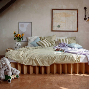 Notre matelas durable en latex naturel est le parfait complément au lit en carton. En général, tous les types de matelas, à l'exception des futons, sont compatibles avec notre lit. Veille toutefois à ce que le matelas ait une hauteur d'au moins 15 cm et qu'il soit moyennement ferme à ferme. Ici tu trouveras également notre linge de lit en coton biologique super doux et notre tête de lit.