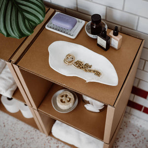 Pour t'assurer de profiter de ton étagère pendant longtemps, elle est fabriquée en carton ondulé de haute qualité. Celui-ci est composé de 54 à 80 % de fibres de papier recyclé et est lui-même 100% recyclable. Cela rend ton étagère en carton non seulement stable et légère, mais aussi écologiquement durable. Afin de ne pas nuire à l'environnement, nous utilisons de la colle végétalienne à base de fécule de maïs et des peintures à base d'eau sans solvant.