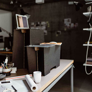 Comme tous les meubles en carton de RIAB, le MonKey Desk est fabriqué à partir du carton ondulé AVANA de la plus haute qualité. Nous obtenons ainsi pour nos produits un niveau élevé de stabilité et de durabilité. De plus, notre mobilier convainc par son faible poids et sa durabilité écologique. Le matériau est composé de 54 à 80 % de fibres de papier recyclé et est 100 % recyclable. Une colle végétalienne d'amidon de maïs lie les différentes feuilles de papier, qui sont finies avec des encres à base d'eau sans solvant. Le résultat est un produit respectueux de l'environnement qui, à la fin de son cycle de vie, peut être éliminé rapidement et facilement dans la poubelle à papier et être réintroduit dans le cycle des production.