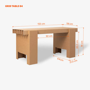 L'utilisation de carton ondulé de haute qualité rend la table GRID non seulement stable, mais aussi écologique et recyclable. Le carton ondulé est un matériau extrêmement durable dont le taux de recyclage varie entre 54 à 80 % et qui est entièrement recyclable via la poubelle à papier. Les différentes couches de papier sont collées avec des adhésifs naturels à base d'amidon de maïs et, pour la variante noire, recouvertes avec des couleurs sans solvants. Grâce à la construction bien pensée des lattes, la table GRID peut supporter des charges élevées tout en restant légère et facile à déplacer. Elle est conforme aux normes DIN EN 12521:2015 et DIN EN 1730:2012.