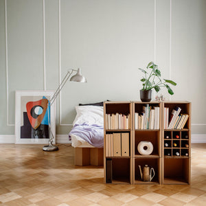 Pour donner à nos meubles en carton la stabilité nécessaire et garantir une longue durée de vie, nous n'utilisons que du carton robuste de la plus haute qualité. Le matériau se caractérise par une variété de propriétés que l'on ne trouve pas dans les matériaux conventionnels utilisés dans la construction de meubles. Par exemple, il est léger, ce qui facilite grandement le déplacement des meubles - surtout lors d'un déménagement. De plus, il préserve d'importantes ressources grâce à son taux de recyclage élevé de 54 à 80 % et peut être entièrement recyclé. Nos meubles en carton sont ainsi réintégrés dans le cycle des matériaux et ne génèrent aucun déchet lorsqu'ils sont éliminés. Des peintures à base d'eau sans solvant viennent terminer les versions colorées de nos meubles. Le résultat est un produit écologiquement durable qui reste abordable et facilite un peu plus ta vie.