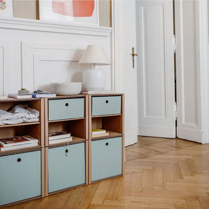 Le plateau d'étagère peut être inséré sans outils et retiré à tout moment. Il est découpé dans un carton ondulé de haute qualité avec un contenu recyclé de 54 à 80 % et est donc à la fois léger et stable. Le fait que l'insertion du plateau d'étagère ne consiste qu'en des fibres de papier collées ensemble avec de l'amidon de maïs végétalien le rend particulièrement respectueux de l'environnement. De plus, tu peux le recycler à la fin de son cycle de vie via la poubelle à papier. C'est non seulement extrêmement pratique pour toi, mais aussi écologiquement durable, car le matériau retourne dans le cycle des matériaux et aucun déchet n'est créé.