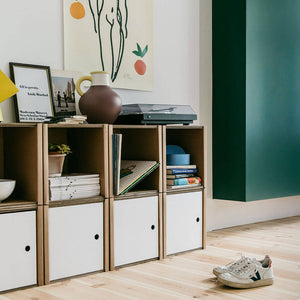 Comme tout autre insert d'étagère, celui-ci peut être inséré dans l'étagère sans outils supplémentaires et est compatible avec toutes nos versions d'étagères. Tu peux retirer ou déplacer la porte d'étagère à tout moment - de manière flexible, selon tes besoins.