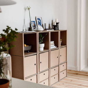 Les tiroirs et la planche d'étagère assortie sont fabriqués en carton ondulé de haute qualité, dont la teneur en matières recyclées est comprise entre 54 et 80 %. Les inserts d'étagère sont à la fois légers et stables et sont produits dans le respect de l'environnement. La colle végétalienne utilisée pour assembler les differentes couches de papier est fabriquée à partir d'amidon de maïs végétalien et les versions blanches, noires et vert sauge sont finies avec des encres à base d'eau sans solvant. Le résultat est un produit écologique et durable qui peut facilement être recyclé via la poubelle à papier et qui est ainsi réintroduit dans le cycle de production.